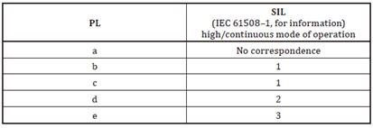 控制系統(tǒng)安全相關(guān)部件在預(yù)期條件下執(zhí)行安全功能的能力分為5級(jí),稱之為性能等級(jí)(PL)。這些性能等級(jí)由每小時(shí)發(fā)生危險(xiǎn)失效的概率來定義。